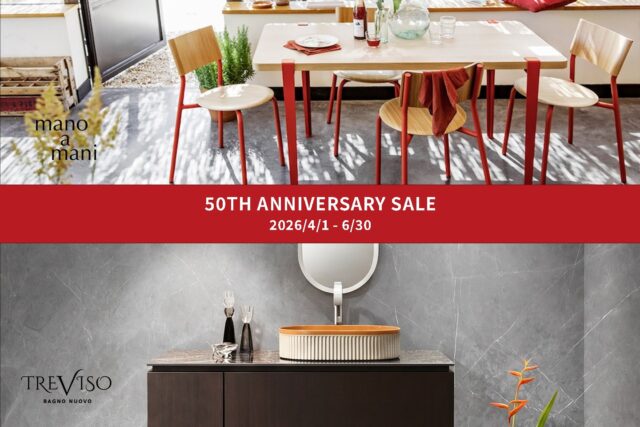 2026年4月1日から6月30日までの期間におきまして、この節目を記念し、当社が展開するバスルームファニチャー事業「Bagno Nuovo(バーニョ・ヌオーヴォ)」および、セレクトライフスタイルショップ「mano a mani(マーノ・ア・マーニ)」にて、50周年記念セールを開催いたします。