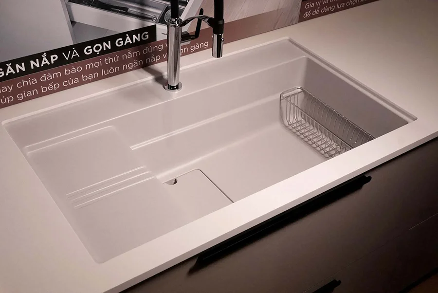 Khi diện tích bếp hạn chế, mỗi mét vuông đều cần được sử dụng tối ưu và hợp lý. Workstation sink biến lòng chậu thành mặt bàn sơ chế phụ – bạn không cần thêm thớt trên bàn bếp, không cần rổ ráo chiếm chỗ trên kệ. Với thói quen nấu nhiều món cùng lúc của gia đình Việt – canh, xào, luộc, cuốn – việc sơ chế ngay tại chậu rửa giúp tiết kiệm thời gian và giữ mặt bàn bếp luôn sạch sẽ.
