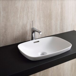 Chậu đặt bàn nằm trọn bên trên mặt kệ, phần thân chậu nhô lên cao. Đây là kiểu lắp phổ biến nhất tại Việt Nam vì dễ thi công, không cần khoét mặt đá phức tạp.