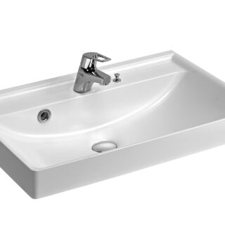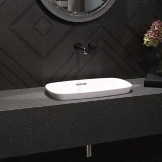 Chậu dương vành là giải pháp trung gian – một phần chậu nằm âm trong mặt kệ, phần còn lại nhô ra phía trước. Kiểu này phù hợp đặc biệt với phòng tắm có mặt kệ hẹp (dưới 450mm) vì phần nhô ra tận dụng không gian bên ngoài mặt kệ.